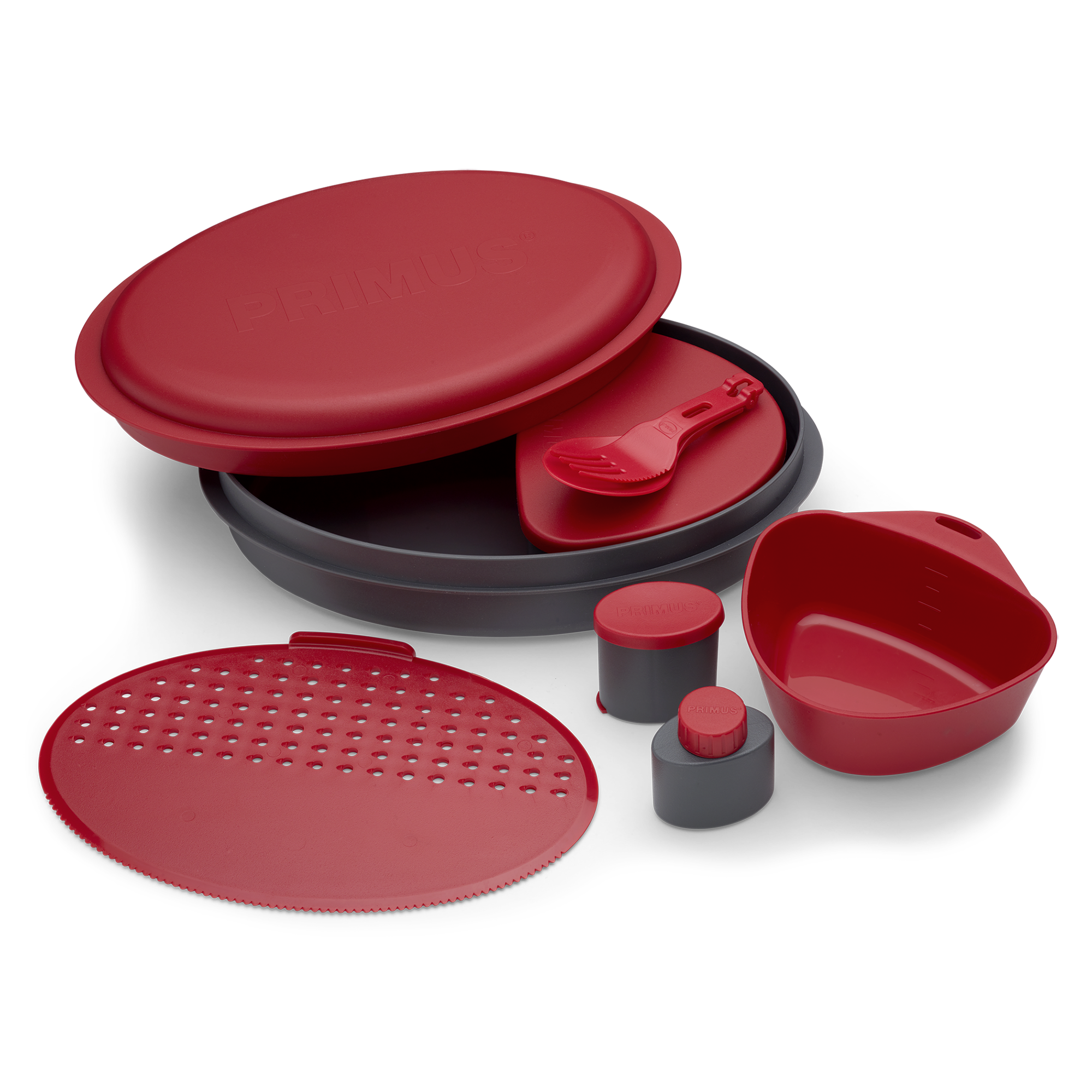 This eight-piece set includes two deep plates, a smaller storage container with tight-fitting lid, a spice jar, a small container for liquids, an outdoor cup, folding spork and an all-in-one cutting board, colander, grater, and knife.
