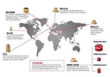 When you’re travelling around the world it is important to use the correct adapter for your gas canister. We want you to be able to use your stove wherever you are. Purchase of our CampFire stove includes a Lindal Valve that fits our Power Gas, Summer Gas and Winter Gas canisters. For other gas canisters, we have a range of connection adapters that fit most of the variants that are available in the market.