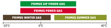Our new SIP Power Gas ensures high pressure output around and even below zero degrees Celsius, just like our regular Primus Power Gas. But we are aware that there are many factors affecting the performance of cooking in cold conditions. This being the case, we recommend Primus Summer Gas during warmer temperatures, and Primus Winter Gas for the best fuel performance in cold weather, below zero degrees Celsius. For maximum reliability in extreme cold conditions, we urge the use of liquid fuel.